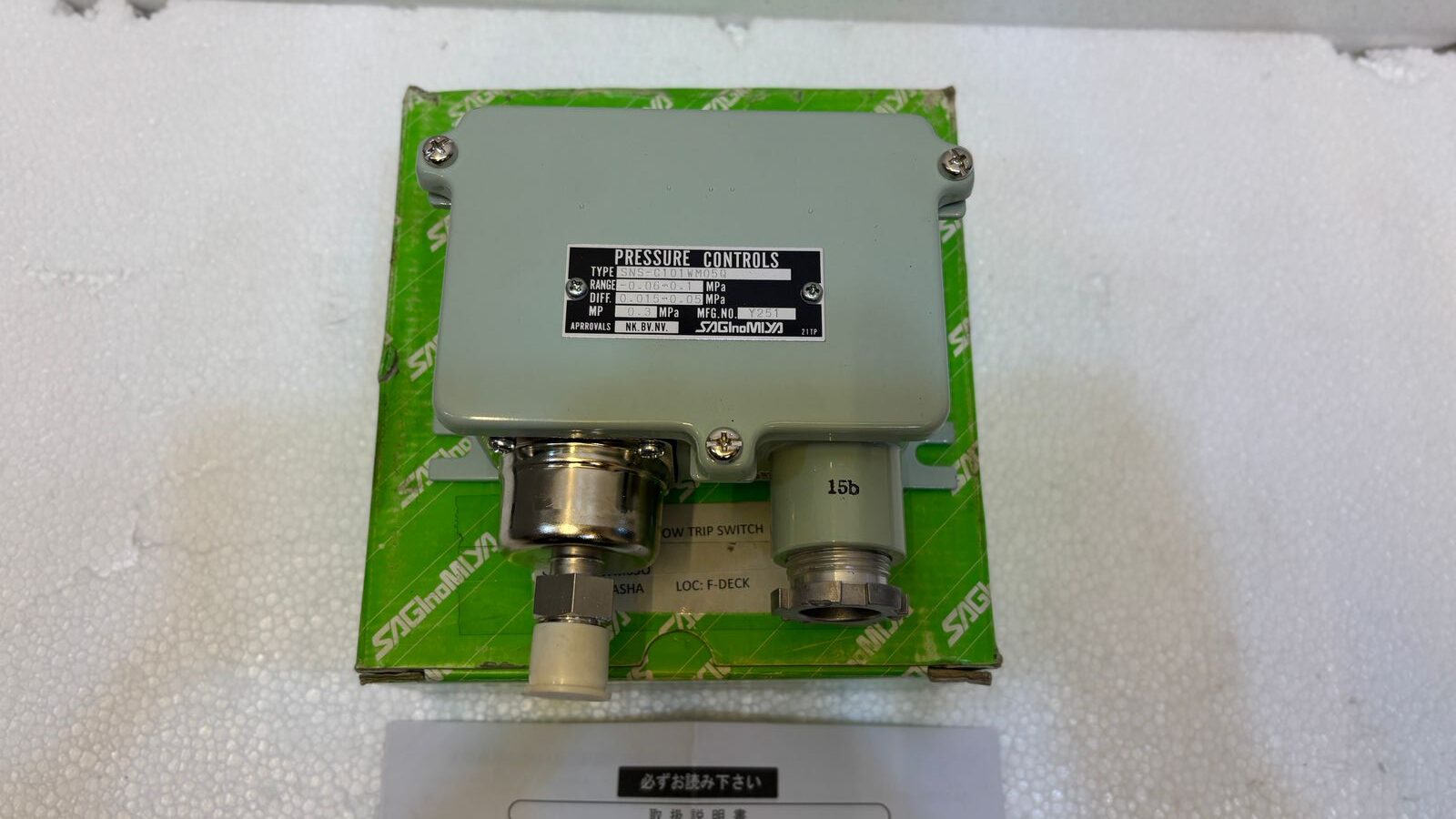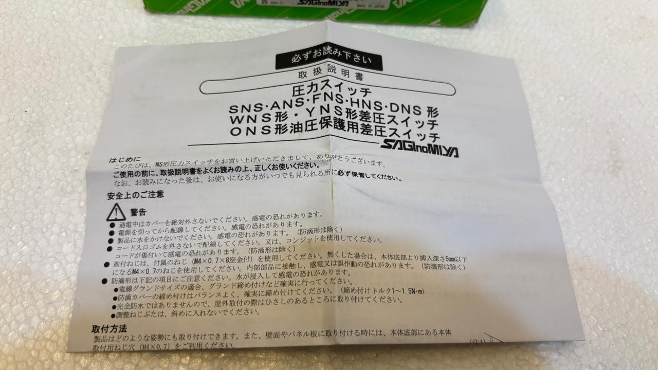 SAGINOMIYA SNS-C101WM05Q Pressure Switch is a Unused products or equipment’s. its manufactured by  SAGINOMIYA, if you want SAGINOMIYA SNS-C101WM05Q Pressure Switch . is product then click on Enquiry Button and fill the necessary details and submit your quote request, we will check availability of products and will sent you to quote 24 to 48 hours you will be received in your registerd email id .